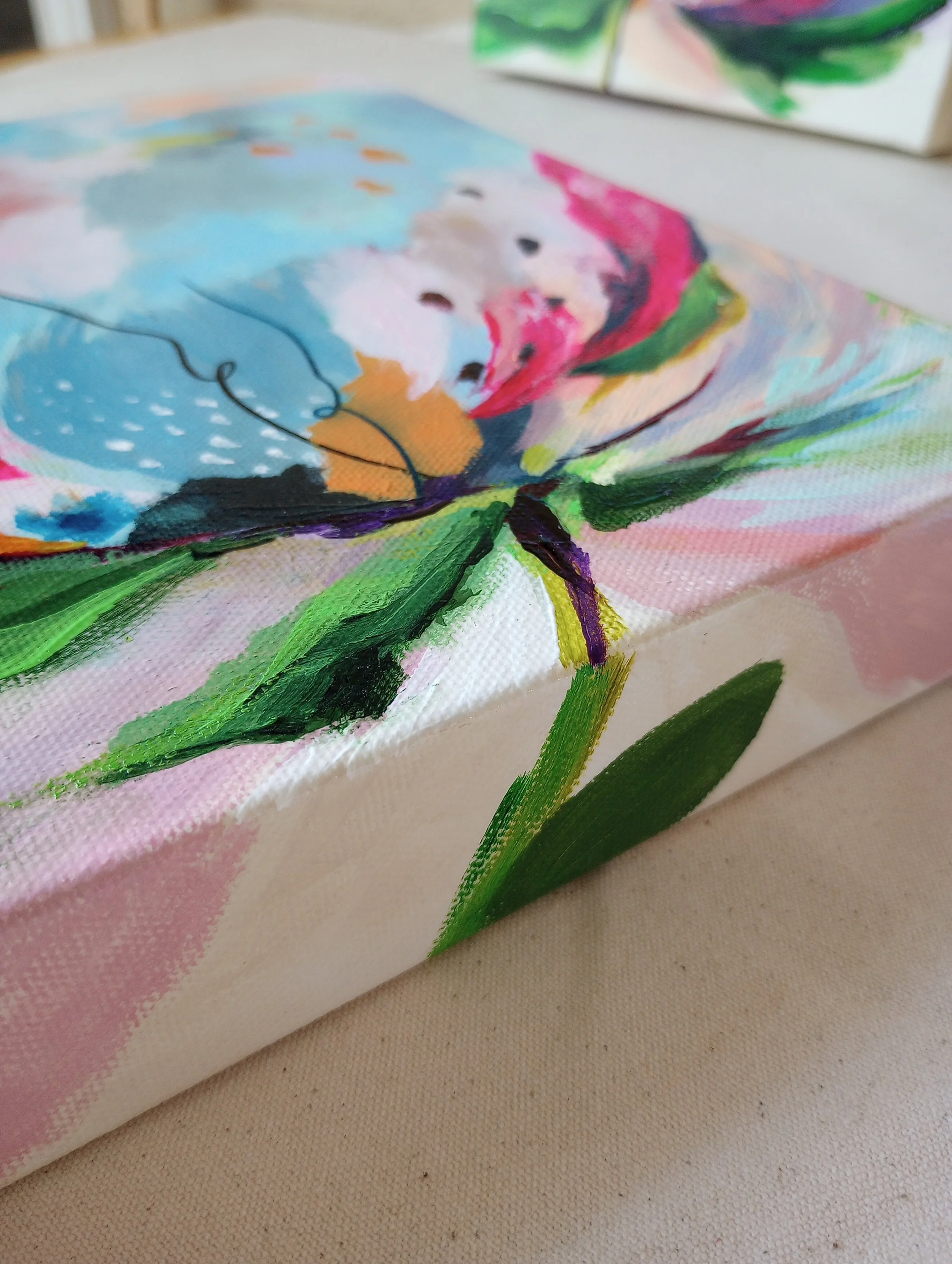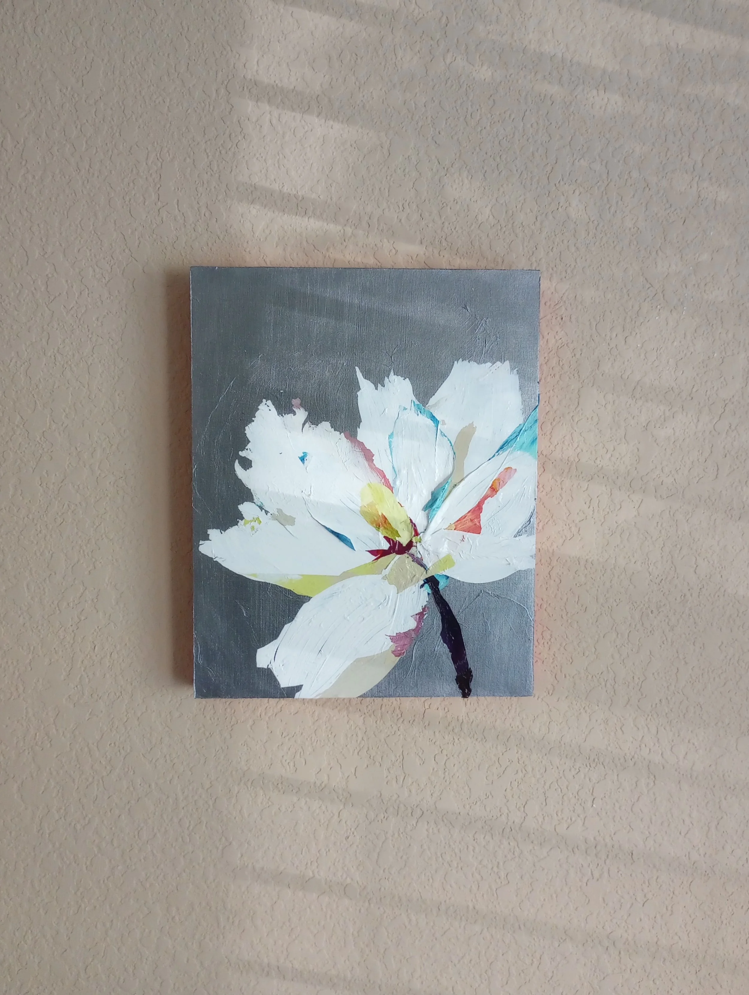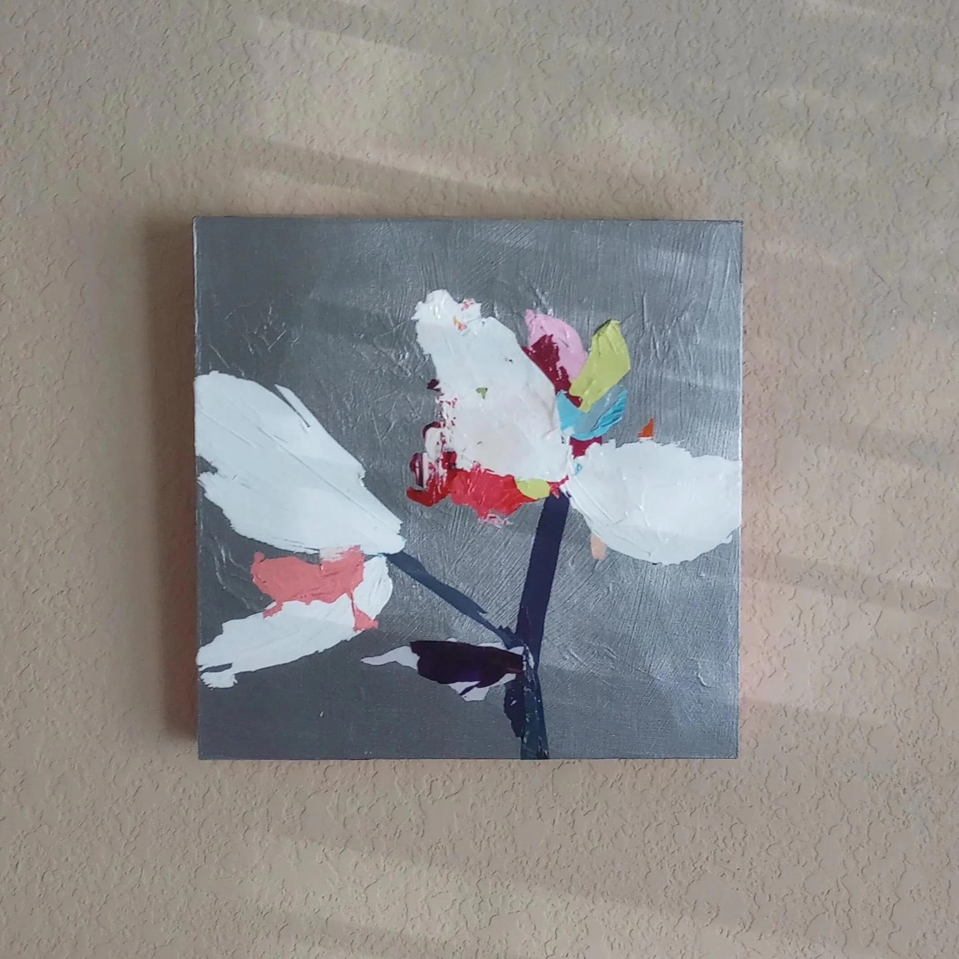 Dried-up paint skins from old palettes are peeled and repurposed in these floral abstracts. These “skins” represent past experiences and perhaps personalities that have been suppressed.